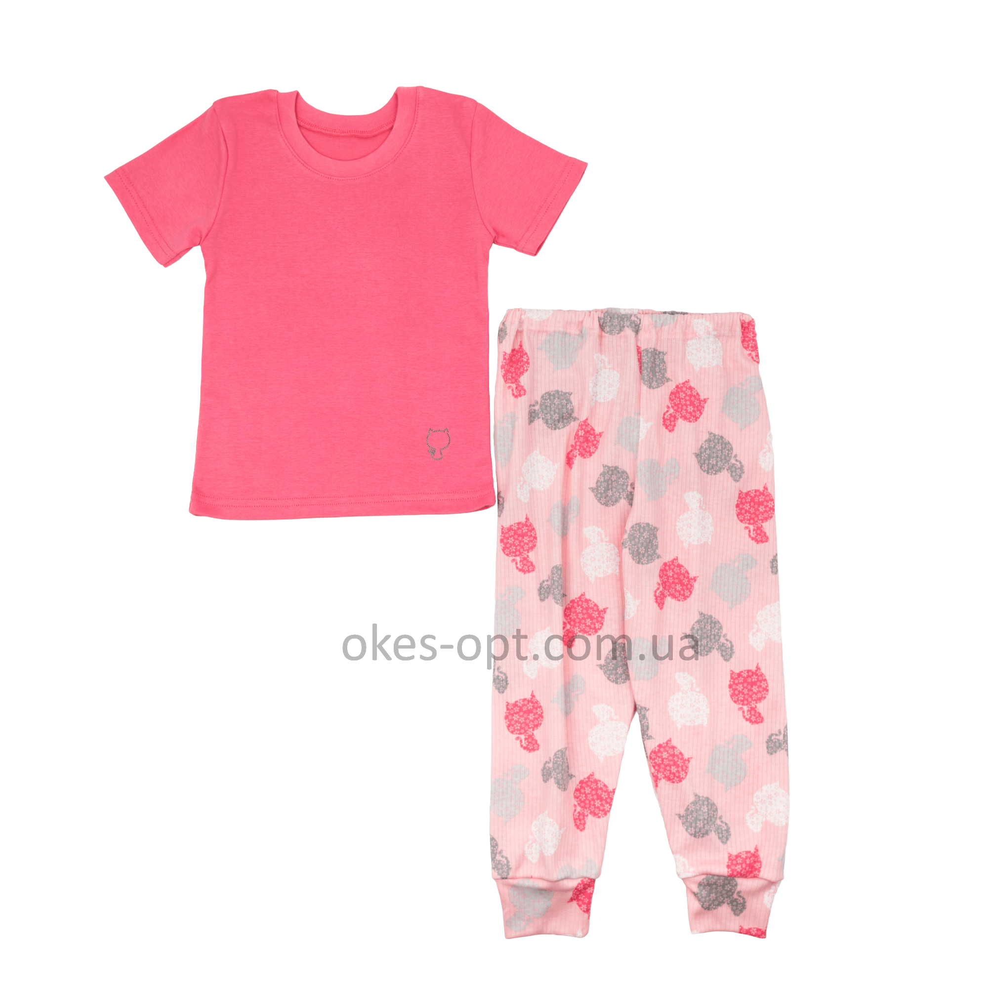 Піжама для дівчинки літня оптом. Супер якість. Футболка зі штанями. Маленька вишивка у вигляді котика на футболці